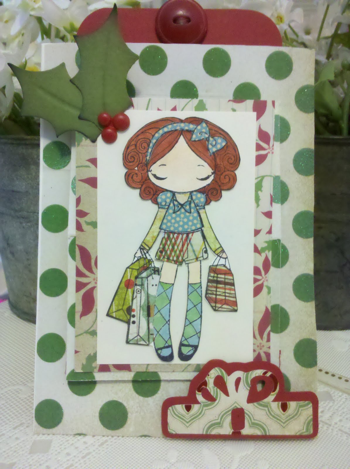 Don't you just love her Purple Hair. She is frightfully wanting to be a little Gothic. She is from the Greeting Farm set called sweet and toxic. The flower is hand made with October afternoon paper. The background paper was from 3 different line jenni bowlin, indie girl and jillibean. Her clothes are from Basic grey Halloween line.